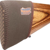 FEATURES:-Greatly improves shooting comfort & accuracy-Easily slips over existing recoil pad, no gunsmithing or drilling-Reduces recoil by 40%-Rubber backed fabric grips to wood or synthetic stocks-Stretchy neoprene fits a large range of stock shapes & sizes-4 sizes of inserts for increased versatility-Angled opening for easy swivel stud access-Brown